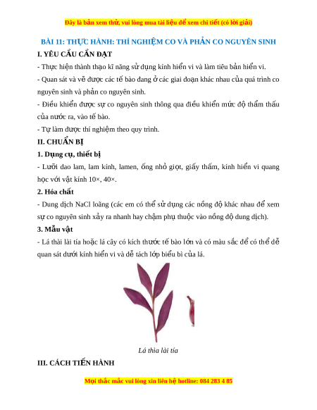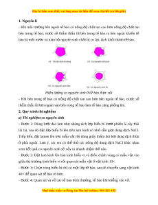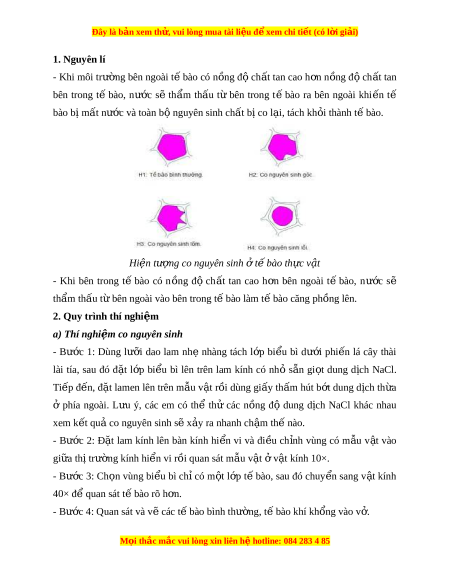 Đây là bản xem th , vu ử i lòng mua tài li u ệ đ xe ể m chi ti t (c ế ó l i ờ gi i ả ) 1. Nguyên li - Khi môi trư ng ơ bên ngoài t ế bào co n ng ô đ ộ ch t ấ tan cao h n ơ n ng ô đ ộ ch t ấ tan bên trong t ế bào, nư c ớ s ẽ th m ẩ th u ấ t ư bên trong t ế bào ra bên ngoài khi n ế tế bào bi mất nư c và t ớ oàn b nguyên s ộ inh ch t ấ b co l i i ạ , tách kh i o thành t bào. ế Hi n t ê ư ng co nguyên s ơ inh t ơ bào t ê h c v ư t â - Khi bên trong t ế bào co n ng ô đ ộ ch t ấ tan cao h n ơ bên ngoài t ế bào, nư c ớ sẽ thẩm th u t ấ bên ngoài ư vào bên trong t bào l ế àm t bào căng ế ph ng l ô ên. 2. Quy trinh thi nghi m ệ a) Thí nghi m