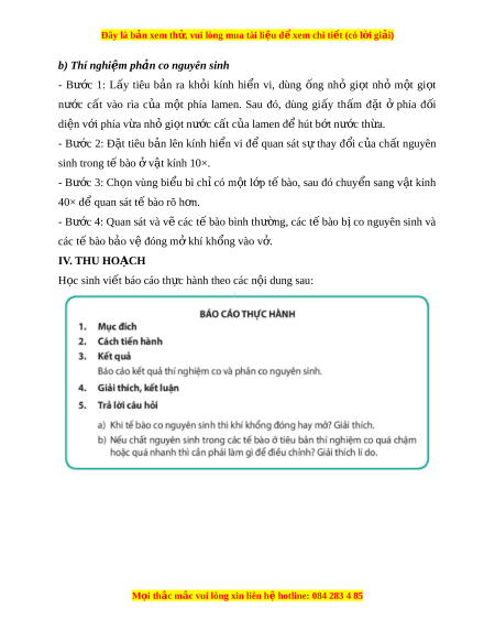 ộ phía lamen. Sau đo, dùng gi y ấ th m ấ đ t ă ở phía đ i ô diện v i ớ phía v a ư nh gi o t o nư c ớ c t ấ c a ủ lamen đ hút ể b t ớ nư c ớ th a. ư - Bư c ớ 2: Đ t ă tiêu b n ả lên kính hi n ể vi đ ể quan sát s ự thay đ i ổ c a ủ ch t ấ nguyên sinh trong t bào ế ở v t â kính 10×. - Bư c ớ 3: Ch n o vùng bi u ể bì ch ỉco m t ộ l p ớ t ế bào, sau đo chuy n ể sang v t â kính 40× đ quan ể sát t bào r ế õ h n. ơ - Bư c ớ 4: Quan sát và v ẽ các t bào ế bình thư ng, ơ các t bào ế b co i nguyên sinh và các t bào b ế o ả v đong m ệ kh ở í khổng vào v . ở IV. THU HOACH H c o sinh vi t ế báo cáo th c hành t ự heo các n i ộ dung sau: M i