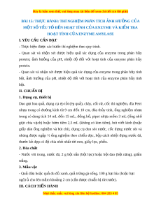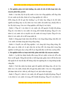 ớ vôi trong, để ở nhi t ệ độ phòng. ng Ố số 3 cho thêm 0,1 mL nư c ớ c t â và chuy n ể vào c c ố nư c ớ sôi trong 10 phut. ng Ố s ố 4 cho thêm 0,1 mL nư c c ớ t â và đ t ể rong nư c đá. ớ - Bư c ớ 3: Dùng pipet ho c ă b m ơ tiêm đ ể l y â 2 mL lòng tr ng ă tr ng, ư tr n ộ đ u ê v i ớ 2 mL nư c c ớ ât đư c ợ dung d ch l i òng tr ng t ă r ng. ư - Bư c ớ 4: Chuy n ể vào m i ỗ ng ố nghi m ệ 1 mL dung d ch i lòng tr ng ă tr ng, ư l c ă đ u, ê quan sát, nh n ậ xét và ghi chép l i ạ sự thay đ i ổ c a ủ dung d ch i trong ng ố nghiệm và th i ơ gian x y ả ra thay đ i ổ các ở ng ( ố b t ă đ u và k â t ê thuc s t ự hay đ i ổ ). 2. Thí nghi m ệ ki m ể tra ho t ạ tính th y phâ ủ n tinh b t ộ c a enzym ủ e amylase - Bư c ớ 1: 2 g b t ộ l c o đư c ợ khu y â đ u ê trong 100 mL nư c