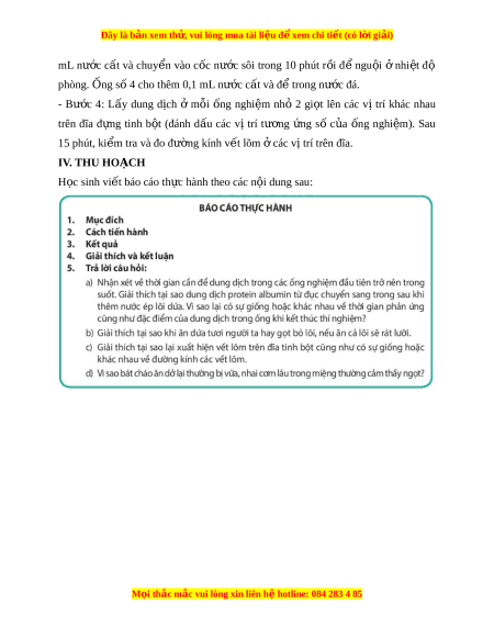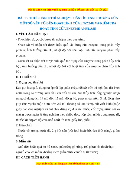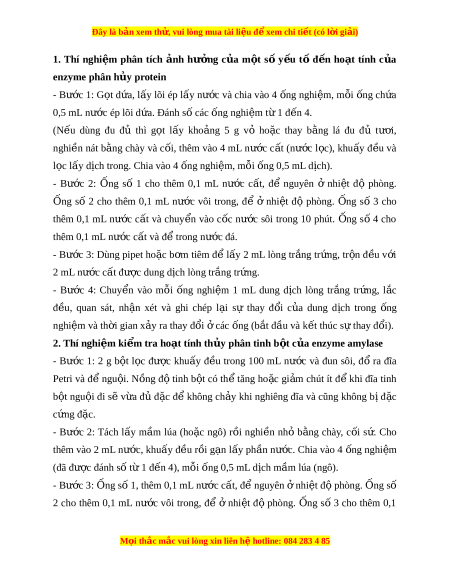 Đây là bản xem th , vu ử i lòng mua tài li u ệ đ xe ể m chi ti t (c ế ó l i ờ gi i ả ) 1. Thí nghi m ệ phân tích nh ả hư ng ở c a ủ m t ộ số y u ế tố đ n ế ho t ạ tính c a ủ enzyme phân h y pr ủ otein - Bư c ớ 1: G t o d a, ư l y â lõi ép l y â nư c ớ và chia vào 4 ng ố nghi m ệ , m i ỗ ng ố ch a ư 0,5 mL nư c ép l ớ õi d a. Đ ư ánh s các ố ng nghi ố m ệ t 1 đ ư n 4. ê (N u ê dùng đu đủ thì g t o l y â kho ng ả 5 g vo ho c ă thay b ng ằ lá đu đủ tư i ơ , nghi n ê nát b ng ằ chày và c i ố , thêm vào 4 mL nư c ớ c t â (nư c ớ l c) o , khu y â đ u ê và l c
