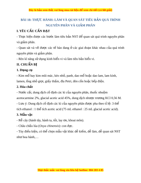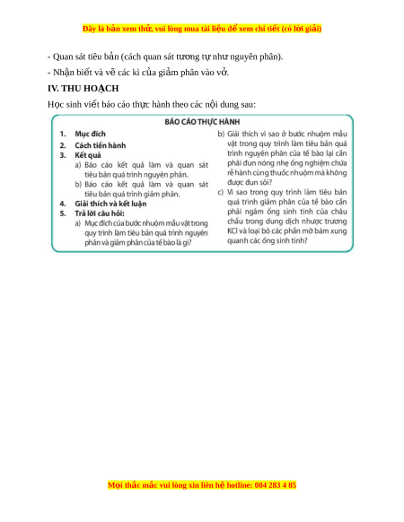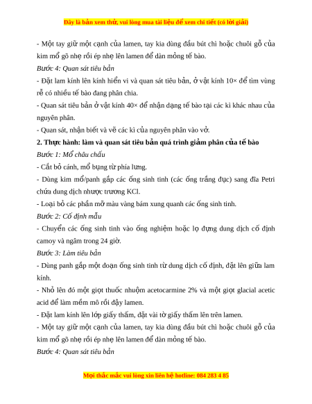 Đây là bản xem th , vu ử i lòng mua tài li u ệ đ xe ể m chi ti t (c ế ó l i ờ gi i ả ) - Quan sát tiêu b n ( ả cách quan sát tư ng t ơ nh ự nguyên phân) ư . - Nh n bi â t ế và v các ẽ kì c a gi ủ m ả phân vào v . ở IV. THU HOACH H c o sinh vi t ế báo cáo th c hành t ự heo các n i ô dung sau: M i