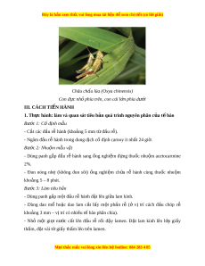 2. Thực hành: làm và quan sát tiêu b n quá t ả rình gi m ả phân c a t ủ bào ế Bư c 1: ơ Mổ châu châu - C t ắ b cánh, m o ô b ng t ụ phí ừ a l ng. ư - Dung kim m / ô panh g p ắ các ng ô sinh tinh (các ng ô tr ng ắ đ c) ụ sang đĩa Petri ch a ứ dung dich như c t ợ rư ng K ơ Cl. - Lo i ạ b các o ph n m ầ m