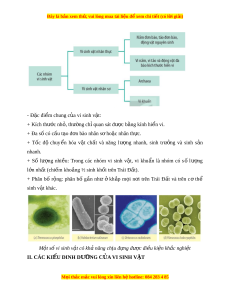 I. CÁC NHÓM VI SINH V T Ậ - Khai ni m ê : Vi sinh v t ậ là nh ng ữ kích thư c ớ nhỏ bé, thư ng ờ ch ỉquan sat đư c ợ dư i ớ kính hi n ể vi. M t ô sô vi khuân - Phân lo i a : D a ự vào thành ph n c ầ u t ấ o, a vi sinh v t ậ đư c chi ợ a thành 2 nhóm: + Vi sinh v t ậ nhân s : ơ g m ồ Archaea và vi khu n. ẩ + Vi sinh v t ậ nhân th c: ự g m ồ vi sinh v t ậ nhân th c ự đ n ơ bào (n m ấ đ n ơ bào, t o ả đ n ơ bào, đ ng ộ v t