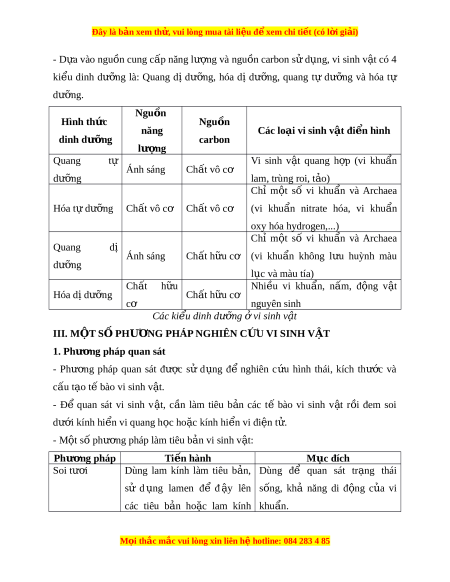 Đây là bản xem th , vu ử i lòng mua tài li u ệ đ xe ể m chi ti t (c ế ó l i ờ gi i ả ) - D a vào ngu ự ồn cung c p năng l ấ ư ng ợ và ngu n ca ồ rbon s d ử ng, vi ụ sinh v t ậ có 4 ki u ể dinh dư ng ỡ là: Quang dị dư ng, ỡ hóa dị dư ng, ỡ quang tự dư ng ỡ và hóa tự dư ng. ỡ Ngu n ồ Hình th c ứ Ngu n ồ năng Các loại vi sinh v t ậ đi n h ể ình dinh dư ng ỡ carbon lư ng ợ Quang tự Vi sinh v t ậ quang h p ợ (vi khu n ẩ Ánh sang Chất vô cơ dư ng ỡ lam, trùng roi, t o) ả Chỉ m t ộ sô vi khu n ẩ và Archaea Hóa t d ự ư ng ỡ Chất vô cơ Chất vô cơ (vi khu n ẩ nitrate hóa, vi khu n ẩ oxy hóa hydrogen,...) Chỉ m t ộ sô vi khu n ẩ và Archaea Quang dị Ánh sang Chất h u ữ cơ (vi khu n ẩ không l u ư huỳnh màu dư ng ỡ l c ụ và màu tía) Chất h u ữ Nhi u ề vi khu n, ẩ n m ấ , đ ng ộ v t ậ Hóa dị dư ng ỡ Chất h u ữ cơ cơ nguyên sinh Các ki u ể dinh dư ng ỡ vi ở sinh v t â III. M T Ộ S P Ố HƯ N Ơ G PHÁP NGHIÊN C U Ứ VI SINH V T Ậ 1. Phư ng ơ pháp quan sát - Phư ng ơ phap quan sat đư c ợ s ử d ng ụ đ ể nghiên c u ư hinh thai, kích thư c ớ và cấu t o a t bào vi ê sinh v t ậ . - Đ ể quan sat vi sinh v t ậ , c n ầ làm tiêu b n ả cac tê bào vi sinh v t ậ r i ồ đem soi dư i ớ kính hi n ể vi quang h c ho o c ă kính hi n vi ể đi n t ê . ử - M t ộ sô phư ng phap l ơ àm tiêu b n ả vi sinh v t ậ : Phư ng ơ pháp Ti n hàn ế h Muc đich Soi tư i ơ