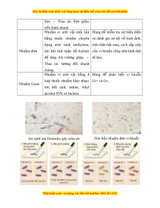 như xanh methylene, tính ch t ấ b t ă màu, cach s p ă x p ê Nhu m ộ đ n ơ tím k t ê tinh ho c ă đ ỏ fuchsin c a u vi khu n ẩ cũng nh ư hinh thai đ ể tăng đ ộ t ư ng ơ phap → t bào. ê Thao tac tư ng ơ đ i ô nhanh chóng. Nhu m ộ vi sinh v t ậ b ng ă 4 Dùng để phân bi t ê vi khu n ẩ lo i a thu c ô nhu m ộ khac nhau: Gr+ và Gr-. Nhu m ộ Gram tím k t ê tinh, iodine, ethyl alcohol 95% và fuchsin. Soi tư i