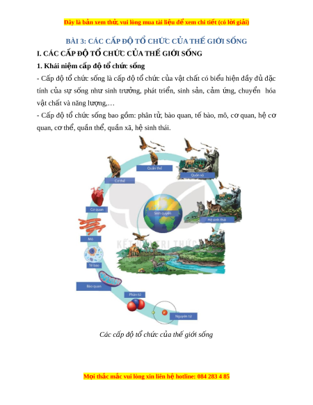 Đây là bản xem th , vu ử i lòng mua tài li u ệ đ xe ể m chi ti t (c ế ó l i ờ gi i ả ) BÀI 3: CÁC CẤP Đ Ộ T C Ổ H C Ứ C A Ủ TH G Ế I I Ớ S N Ố G I. CÁC CẤP Đ Ộ T C Ổ H C Ứ C A Ủ THẾ GI I Ớ S N Ố G 1. Khái ni m ệ c p đ ấ t ộ ch ổ c s ứ ng ố - C p ấ độ tổ ch c ứ s ng ố là c p ấ đ ộ t ổ ch c ứ c a ủ v t ậ ch t ấ có bi u ể hi n ệ đ y ầ đ ủ đ c ặ tính c a ủ sự s ng ố như sinh trư ng, ở phát tri n, ể sinh s n, ả c m ả ng, ứ chuy n ể hóa v t