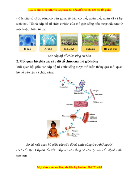 Đây là bản xem th , vu ử i lòng mua tài li u ệ đ xe ể m chi ti t (c ế ó l i ờ gi i ả ) - Các c p ấ tổ ch c ứ s ng ố cơ b n ả g m ồ : tế bào, cơ th , ể qu n ầ th , ể qu n ầ xã và hệ sinh thái. T t ấ cả c p ấ đ ộ tổ ch c ứ cơ b n ả c a ủ th ế gi i ớ s ng ố đ u ề đư c ợ c u ấ t o ạ từ m t ộ hoặc nhi u t ề bào. ế Cac câp đô tô ch c ư sông c b ơ n ả 2. M i ố quan h gi ệ a các c ữ ấp đ t ộ ch ổ c c ứ a t ủ h g ế i i ớ s ng ố Mối quan hệ gi a ữ các c p ấ độ tổ ch c ứ s ng ố đư c ợ thể hi n ệ thông qua m i ố quan hệ v c ề ấu t o ạ và ch c năng: ứ