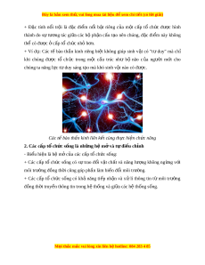ầ thể khác loài cùng t n ồ t i ạ trong m t ộ khu v c ự đ a ị lí vào th i ờ đi m ể nhất đ nh t ị o nên qu ạ n xã. ầ + Các qu n xã t ầ ư ng t ơ ác v i ớ nhau và v i ớ môi trư ng ờ t o nên h ạ s ệ inh thái. - V ề ch c ứ năng: Các c p ấ đ t ộ ổ ch c ứ ho t ạ đ ng ộ luôn th ng ố nh t ấ v i ớ nhau đ ể duy trì các ho t ạ đ ng ộ s ng ố thông qua s ự truy n ề năng lư ng ợ và v t ậ ch t ấ gi a ữ các c p ấ độ. Ví d : ụ Các c p ấ độ tổ ch c ứ s ng ố còn liên hệ v i ớ nhau b i ở quá trình chuy n ể hóa v t ậ ch t ấ và năng lư ng ợ trong thế gi i ớ s ng. ố Ngu n ồ năng lư ng ợ cung c p ấ cho thế gi i ớ s ng ố chủ y n ế đ n ế từ M t ặ Tr i ờ và đư c ợ truy n ề từ c p ấ độ tổ ch c ứ này sang cấp đ t ộ ổ ch c khác ứ c a t ủ h gi ế i ớ sống. II. ĐẶC ĐI M Ể CHUNG C A Ủ TH G Ế I I Ớ S N Ố G Đặc đi m ể chung c a ủ các c p ấ đ ộ t ổ ch c ứ s ng ố là: Đư c ợ tổ ch c ứ theo nguyên t c ắ th b ứ ậc; là nh ng h ữ m ệ và t ở đi ự u ề chỉnh; liên t c ụ ti n ế hóa. 1. Th gi ế i ớ s ng ố đư c ơ t ch ổ ức theo nguyên t c t ắ h b ứ c ậ - Th ế gi i ớ s ng ố đư c ợ t ổ ch c ứ theo nguyên t c ắ th ứ b c ậ có nghia tổ ch c ứ sống cấp dư i ớ làm n n t ề ng đ ả xây d ể ng ự nên t ch ổ c ứ s ng c ố p t ấ rên. - Tổ ch c ứ c p