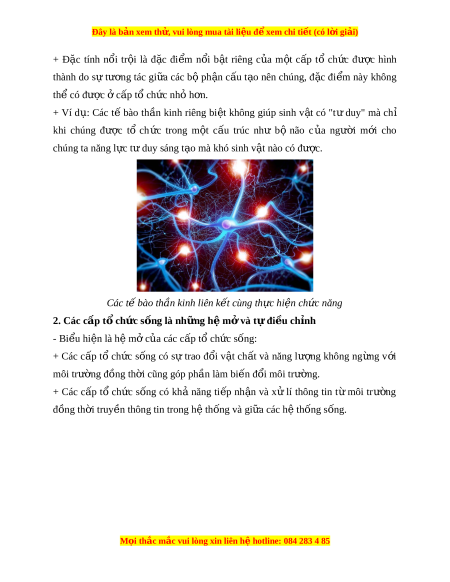 Đây là bản xem th , vu ử i lòng mua tài li u ệ đ xe ể m chi ti t (c ế ó l i ờ gi i ả ) + Đ c ặ tính n i ổ tr i ộ là đ c ặ đi m ể n i ổ b t ậ riêng c a ủ m t ộ c p ấ tổ ch c ứ đư c ợ hình thành do sự tư ng ơ tác gi a ữ các b ộ ph n ậ c u ấ t o ạ nên chúng, đ c ặ đi m ể này không th có ể đư c ợ c ở p t ấ ổ ch c nh ứ ỏ h n. ơ + Ví d : ụ Các t ế bào th n ầ kinh riêng bi t ệ không giúp sinh v t ậ có "t ư duy" mà chỉ khi chúng đư c ợ t ổ ch c ứ trong m t ộ c u ấ trúc như b ộ não c a ủ ngư i ờ m i ớ cho chúng ta năng l c t ự duy s ư áng t o m ạ à khó sinh v t ậ nào có đư c. ợ Cac t bao t ê hân kinh liên k t ê cung th c hi ư n ch ệ c năng ư 2. Các cấp t ch ổ c s ứ ng l ố à nh ng h ữ m ệ và t ở đi ự u ch ề nh ỉ - Bi u hi ể n l ệ à h m ệ c ở a ủ các cấp tổ ch c s ứ ống: + Các c p ấ tổ ch c ứ s ng ố có sự trao đ i ổ v t ậ ch t ấ và năng lư ng ợ không ng ng ừ v i ớ môi trư ng đ ờ ồng th i ờ cũng góp ph n l ầ àm bi n đ ế i ổ môi trư ng. ờ + Các c p ấ t ổ ch c ứ s ng ố có kh ả năng ti p ế nh n ậ và x ử lí thông tin t ừ môi trư ng ờ đồng th i ờ truy n t ề hông tin trong h t ệ h ng và ố gi a ữ các h t ệ h ng s ố ng. ố M i