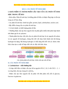 ồ : protein, lipid, carbohydrate, nucleic acid. - Đ c ặ đi m ể chung c a cac ủ phân t s ử inh h c: ọ + Có kích thư c và kh ớ i ố lư ng phân ợ t l ử n. ớ + Thư ng ờ đư c ợ c u ấ t o ạ theo nguyên t c ắ đa phân g m ồ nhi u ề đ n ơ phân h p ợ thành nên được g i ọ là cac polymer. + Thành ph n ầ hóa h c ọ ch ủ y u ê c a ủ cac phân t s ử inh h c ọ là cac nguyên t ử carbon