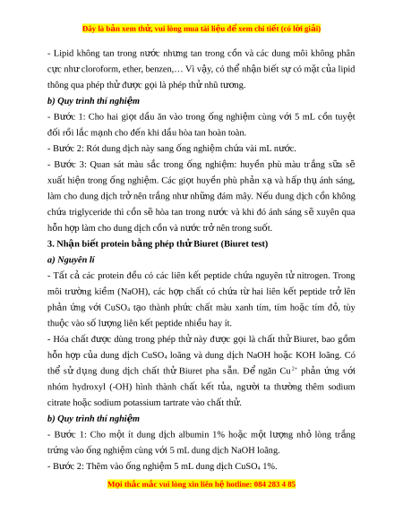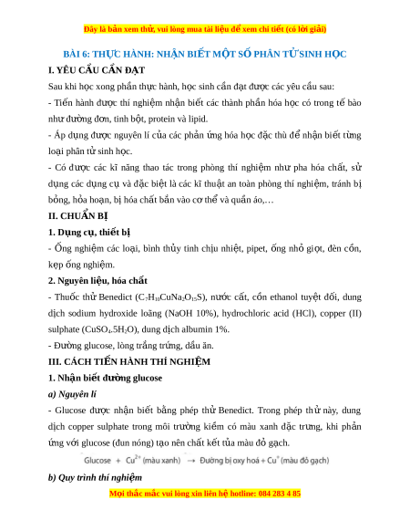 Đây là bản xem th , vu ử i lòng mua tài li u ệ đ xe ể m chi ti t (c ế ó l i ờ gi i ả ) BÀI 6: TH C Ự HÀNH: NH N Ậ BI T Ế M T Ộ S P Ố HÂN T SI Ử NH H C Ọ I. YÊU CÂU CÂN ĐAT Sau khi h c o xong ph n t â h c ư hanh, h c s o inh c n đ â t a đư c ơ cac yêu c u s â au: - Ti n ế hanh đư c ơ thí nghi m ệ nh n ậ bi t ế cac thanh ph n â hóa h c o có trong t ế bao nh đ ư ư ng ờ đ n, t ơ inh b t ộ , protein va lipid. - Áp d ng ụ đư c ơ nguyên lí c a ủ cac ph n ả ng ứ hóa h c o đ c ặ thù đ ể nh n ậ bi t ế t ng ừ lo i a phân t s ử inh h c. o - Có đư c