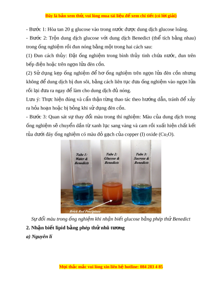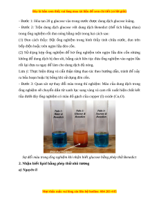 ơ 1: Hòa tan 20 g glucose vao trong nư c đ ơ ư c ơ dung d ch ị glucose loang. - Bư c ơ 2: Tr n ộ dung d ch ị glucose v i ơ dung d ch ị Benedict (thể tích b ng ă nhau) trong ng nghi ô m ệ r i ô đun nóng b ng ă m t ộ trong hai cach sau: (1) Đun cach th y: ủ Đ t ặ ng ô nghi m ệ trong binh th y ủ tinh ch a ứ nư c, ơ đun trên b p đi ế n ho ệ c ặ trên ng n l o a đen c ử n. ô (2) S ử d ng ụ k p e ng ô nghi m ệ đ ể hơ ng ô nghi m ệ trên ng n o l a ử đen c n ô nh ng ư không đ ể dung d ch ị b ịđun sôi, b ng ă cach liên t c ụ đ a ư ng ô nghi m ệ vao ng n o l a ử rôi l i a đ a r ư a ngay đ l ể am cho dung d ch đ ị nóng. ủ L u ư y: Th c ư hi n ệ đung va c n â th n ậ t ng ừ thao tac theo hư ng ơ d n, â tranh đ ể x y ả ra h a ho ỏ n a ho c ặ b b ị ng ỏ khi s d ử ng đen ụ c n. ô - Bư c ơ 3: Quan sat sư thay đ i ổ mau trong thí nghi m ệ : Mau c a ủ dung d ch ị trong ông nghiệm s e chuy n ể d n â t ừ xanh l c ụ sang vang va cam r i ô xu t ấ hi n ệ ch t ấ k t ế t a ủ dư i ơ đay ông nghi m ệ có mau đ g ỏ ch a c a copper ủ (I) oxide (Cu2O). S đ