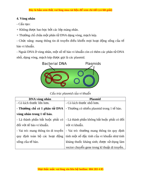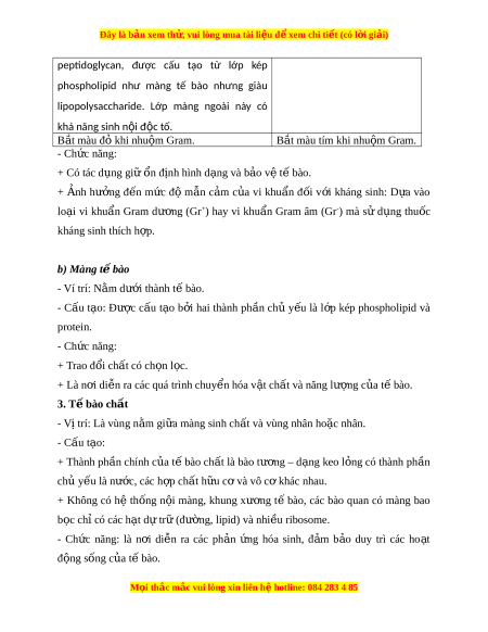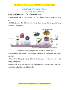 Đây là bản xem th , vu ử i lòng mua tài li u ệ đ xe ể m chi ti t (c ế ó l i ờ gi i ả ) CHƯ N Ơ G 2: CÂU TRUC T B Ê AO BAI 7: T B Ê AO NHÂN SƠ I. ĐẶC ĐI M C Ể HUNG C A Ủ T B Ê AO NHÂN SƠ - Có kích thư c ớ nhỏ (1 µm đ n ế 5 µm), thư ng ờ chỉ quan sát đư c ợ dư i ớ kính hi n ể vi. - Có kh a năng trao đ i ô ch t â v i ớ môi trư ng ờ nhanh chóng, kh a năng sinh trư ng ơ va sinh s n a cung nhanh. Kích thư c c ớ a ủ m t ô s l ô o i a t bao va c ê p đ â d ô ư i ớ t bao ê - Chưa có nhân hoan ch nh, ỉ ch a