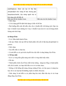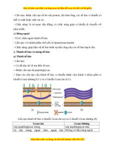 lipopolysaccharide. Lớp màng ngoài này có kha năng sinh n i ô đ c ô tô. B t ắ mau đ khi ỏ nhu m ộ Gram. B t ắ mau tím khi nhu m ộ Gram. - Ch c ư năng: + Có tác d ng gi ụ ữ n đ ô nh h i ình d ng ạ va b o a v t ệ ế bao. + nh Ả hư ng ơ đ n ế m c ư độ m n ẫ c m a c a ủ vi khu n ẩ đ i ố v i ớ kháng sinh: D a ư vao lo i ạ vi khu n ẩ Gram dư ng ơ (Gr+) hay vi khu n