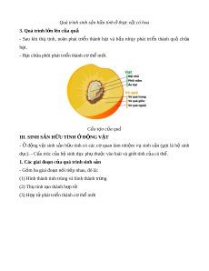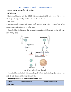 BÀI 33: SINH S N Ả H U Ữ TÍNH SI Ở NH V T Ậ I. KHÁI NI M Ệ SINH S N Ả H U Ữ TÍNH 1. Khái ni m ệ - Khái ni m ệ : Sinh s n ả h u ữ tính là hình th c ứ sinh s n ả có s ự k t ế h p ợ y u ế t ố đ c ự và y u ế tố cái t o ạ nên h p t ợ . H ử p t ợ phát ử tri n t ể hành c t ơ h m ể i ớ . - Đ c ặ đi m ể : + Trong hình th c ứ sinh s n ả h u ữ tính, c ơ th ể con nh n ậ đư c ợ ch t ấ di truy n ề t ừ c b ả và ố mẹ nên mang đ c ặ đi m ể c a c ủ b ả ố và m . ẹ + Sinh s n ả h u