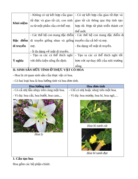 ạ ra các cá thể thích nghi t t ố Ý nghĩa v i ớ đi u ki ề n s ệ ống ổn đ nh. ị h n ơ v i ớ sự thay đ i ổ c a ủ môi trư ng ờ sống. II. SINH SẢN H U Ữ TÍNH Ở TH C Ự V T Ậ CÓ HOA - Hoa là cơ quan sinh s n c ả a ủ th c v ự t ậ có hoa. - Có hai lo i ạ hoa là hoa lư ng t ỡ ính và hoa đ n t ơ ính. Hoa lư ng t ỡ ính Hoa đ n t ơ ính - Có cả nhị lẫn nh y ụ trên cùng m t ộ hoa.