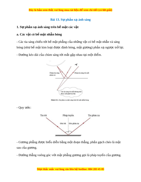 Đây là bản xem th , vu ử i lòng mua tài li u ệ đ xe ể m chi ti t (c ế ó l i ờ gi i ả ) Bài 13. S ph ự n x ả ánh s ạ áng 1. Sự phản x ánh s ạ áng trên b m ề t ặ các v t ậ a. Các vật có b m ề ặt nh n bóng ẵ - Các tia sáng chi u ế t i ớ b m ề t ặ ph ng ẳ c a nh ủ ng v ữ t ậ có b m ề t ặ nh n ẵ và sáng bóng (nh b ư m ề t ặ kim lo i ạ đư c đánh bóng, m ợ t ặ gư ng) ơ ph n x ả ng ạ ư c t ợ r l ở i ạ . - Đư ng kéo dài ờ c a chùm ủ sáng t i ớ m t ắ g p ặ nhau t i ạ m t ộ đi m ể . - Quy ư c: ớ - Gư ng ph ơ ng ẳ đư c bi ợ u ể di n ễ b ng m ằ t ộ đo n ạ th ng, ph ẳ n g ầ ch ạ chéo là m t ặ sau c a g ủ ư ng. ơ - Đư ng t ờ h ng ẳ vuông góc v i ớ m t ặ ph ng ẳ gư ng g ơ i ọ là pháp tuy n c ế a g ủ ư ng. ơ M i