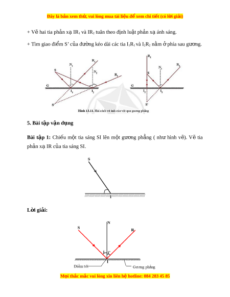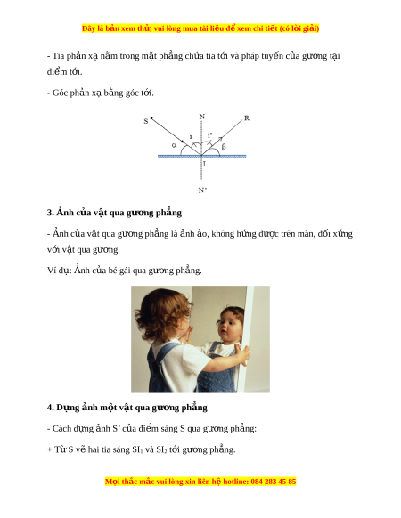 Đây là bản xem th , vu ử i lòng mua tài li u ệ đ xe ể m chi ti t (c ế ó l i ờ gi i ả ) - Tia ph n ả x n ạ m ằ trong m t ặ ph ng ẳ ch a t ứ ia t i ớ và pháp tuy n c ế a g ủ ư ng ơ t i ạ đi m ể t i ớ . - Góc ph n ả x b ạ ng ằ góc t i ớ . 3. Ảnh c a v ủ t ậ qua gư ng ph ơ ng ẳ - nh c Ả a v ủ t ậ qua gư ng ph ơ ng ẳ là nh ả o, không h ả ng đ ứ ư c ợ trên màn, đ i ố x ng ứ v i ớ v t ậ qua gư ng. ơ Ví d : ụ nh c Ả a ủ bé gái qua gư ng ơ ph ng. ẳ 4. Dựng ảnh m t ộ v t ậ qua gư ng ph ơ ng ẳ - Cách d ng ự nh S’ ả c a ủ đi m ể sáng S qua gư ng ph ơ ng: ẳ + T S v ừ hai ẽ tia sáng SI1 và SI2 t i ớ gư ng ph ơ ng. ẳ M i