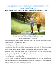 Ề ẤU TRÚC VÀ CÁC HO T Ạ Đ N Ộ G S N Ố G TRONG C Ơ TH SI Ể NH V T Ậ I. S Ự TH N Ố G NHẤT GI A Ữ CÁC HO T Ạ Đ N Ộ G S N Ố G TRONG C Ơ THỂ Khi ch y ạ b có s ộ ph ự ối h p, t ợ h ng nh ố t ấ gi a các ữ c quan ơ và các ho t ạ đ ng s ộ ống trong cơ thể S t ự hống nhất v c ề u t ấ rúc và ho t ạ đ ng s ộ ng c ố a ủ c t ơ h l ể à nh ng ữ bi u ể hi n cho ệ th y ấ cơ th s ể inh v t ậ là m t ộ th t ể h ng nh ố t ấ : - S t ự hống nhất v c ề u t ấ rúc: + Cơ thể đ n ơ bào ch ỉcó m t ộ t ế bào nh ng ư cũng th c ự hi n ệ đư c ợ t t ấ c ả các ho t ạ đ ng ộ sống c a ủ m t ộ c t ơ hể nh s ờ ph ự ối h p gi ợ a ữ các thành ph n c ầ u t ấ rúc c a ủ t bào. ế + Cơ thể đa bào g m ồ nhi u