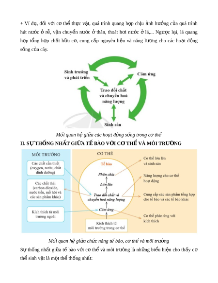 ề tế bào phân hoá thành các mô, cơ quan khác nhau cùng phối h p t ợ h c hi ự n t ệ t ấ c các ả ho t ạ đ ng ộ s ng c ố a c ủ ơ th . ể - S t ự hống nhất v ho ề t ạ đ ng s ộ ng: ố + Trong cơ thể sinh v t ậ , các ho t ạ đ ng ộ s ng ố tác đ ng ộ qua l i ạ , trong đó, trao đ i ổ ch t ấ g n ắ li n ề v i ớ chuy n ể hoá năng lư ng, ợ nh t ờ rao đ i ổ ch t ấ và chuy n ể hoá năng lư ng, ợ cơ th s ể inh trư ng, ở phát tri n, c ể m ả ng và s ứ inh s n. ả + Ví d , ụ đ i ố v i ớ cơ thể th c ự v t ậ , quá trình quang h p ợ ch u ị nh ả hư ng ở c a ủ quá trình hút nư c ớ ở r , ễ v n ậ chuy n ể nư c ớ ở thân, thoát h i ơ nư c ớ ở lá,... Ngư c ợ l i ạ , lá quang h p ợ tổng h p ợ ch t ấ h u ữ c , ơ cung c p ấ nguyên li u ệ và năng lư ng ợ cho các ho t ạ đ ng ộ sống c a ủ cây.