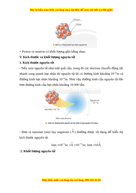 Đây là bản xem th , vu ử i lòng mua tài li u ệ đ xe ể m chi ti t ế (có l i ờ gi i ả ) + Proton và neutron có kh i ố lư ng g ợ n b ầ ng nhau. ằ V. Kích thư c và kh ớ i ố lư ng nguyên t ợ ử