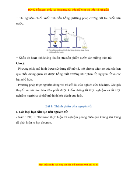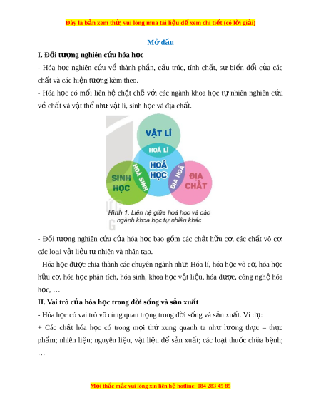 Đây là bản xem th , vu ử i lòng mua tài li u ệ đ xe ể m chi ti t (c ế ó l i ờ gi i ả ) M đ ở ầu I. Đ i ố tư ng ng ợ hiên c u hóa h ứ c ọ - Hóa h c ọ nghiên c u ứ về thành ph n, ầ c u ấ trúc, tính ch t ấ , sự bi n ế đ i ổ c a ủ các chất và các hi n t ệ ư ng kèm ợ theo. - Hóa h c ọ có m i ố liên hệ ch t ặ chẽ v i ớ các ngành khoa h c ọ tự nhiên nghiên c u ứ v ch ề ất và v t ậ th nh ể v ư t ậ lí, sinh h c và đ ọ a ch ị t ấ . - Đối tư ng ợ nghiên c u ứ c a ủ hóa h c ọ bao g m ồ các ch t ấ h u ữ c , ơ các ch t ấ vô c , ơ các lo i ạ v t ậ li u t ệ nhi ự ên và nhân t o. ạ - Hóa h c ọ đư c