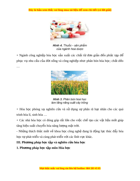 Đây là bản xem th , vu ử i lòng mua tài li u ệ đ xe ể m chi ti t (c ế ó l i ờ gi i ả ) + Ngành công nghi p ệ hóa h c ọ s n ả xu t ấ các ch t ấ từ đ n ơ gi n ả đ n ế ph c ứ t p ạ để ph c ụ vụ nhu c u ầ c a ủ đ i ờ s ng ố và công nghi p ệ nh : ư phân bón hóa h c; ọ ch t ấ d o ẻ … + Hóa h c ọ phóng xạ nghiên c u ứ và sử d ng ụ sự phân rã h t ạ nhân cho các quá trình hóa lí, sinh hóa … + Các nhà hóa h c ọ có đóng góp r t ấ l n ớ cho vi c ệ chế t o ạ các v t ậ li u ệ m i ớ giúp tăng hi u s ệ u t ấ chuy n ể hóa năng lư ng m ợ t ặ tr i ờ . - Nh ng ữ thách th c ứ m i ớ về khoa h c