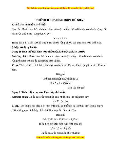 Đây là bản xem th , vu ử i lòng mua tài li u ệ đ xe ể m chi ti t ế (có l i ờ gi i ả ) THỂ TÍCH C A Ủ HÌNH H P Ộ CH N Ữ H T Ậ 1. Th t ể ích hình h p ch ộ nh ữ t ậ Quy t c: ắ Muốn tính th t ể ích hình h p ch ộ nh ữ t ậ ta l y chi ấ u dài ề nhân v i ớ chi u ề r ng r ộ i ồ nhân v i ớ chi u cao ( ề cùng đ n v ơ ị đo). V = a × b × c