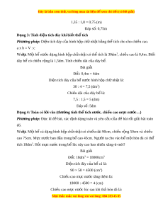 ể ích là 30dm3, chi u cao l ề à 0,4m. Bi t ế đáy bể có chi u r ề ng l ộ à 1,5dm. Tính chi u dài ề c a ủ đáy b . ể Bài gi i ả Đ i ổ : 0,4m = 4dm Di n t ệ ích đáy c a ủ b n ể ư c ớ hình h p ộ ch nh ữ t ậ là: 30 : 4 = 7,5 (dm2) Chi u dài ề c a ủ đáy b l ể à: 7,5 : 1,5 = 5 (dm) Đáp số: 5dm Dạng 4: Toán có l i ờ văn (thư ng ờ tính th t ể ích nư c, ớ chi u cao m ề c n ự ư c…) ớ Phư ng ơ pháp: Đ c ọ kĩ đ bài ề , xác đ nh d ị ng ạ toán và yêu c u c ầ a đ ủ ề bài r i ồ gi i ả bài toán đó. Ví d . ụ M t ộ b cá d ể ng ạ hình h p ch ộ nh ữ t ậ có chi u dài ề 90cm, chi u ề r ng 50cm ộ và chi u ề cao 75cm. M c ự nư c ban đ ớ u t ầ rong b cao 45cm ể . Ngư i ờ ta cho vào b m ể t ộ hòn đá có th ể tích 18dm3. H i ỏ m c n ự ư c