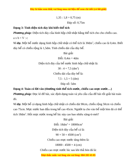 Đây là bản xem th , vu ử i lòng mua tài li u ệ đ xe ể m chi ti t ế (có l i ờ gi i ả ) 1,35 : 1,8 = 0,75 (m) Đáp số: 0,75m Dạng 3: Tính di n t ệ ích đáy khi bi t ế th t ể ích Phư ng ơ pháp: Di n t ệ ích đáy c a ủ hình h p ch ộ nh ữ t ậ b ng t ằ h t ể ích cho cho chi u cao. ề a x b = V : c Ví d . ụ M t ộ b n ể ư c ớ d ng hì ạ nh h p ch ộ ữ nh t ậ có th t