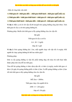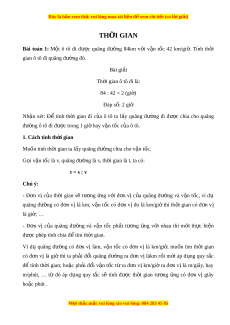 ậ ốc là v, quãng đư ng l ờ à s, th i ờ gian là t, ta có: t = s : v Chú ý: - Đ n ơ vị c a ủ th i ờ gian sẽ tư ng ơ ng ứ v i ớ đ n ơ vị c a ủ quãng đư ng ờ và v n ậ t c, ố ví dụ quãng đư ng ờ có đ n ơ vị là km, v n ậ t c ố có đ n ơ v ịđo là km/gi ờ thì th i ờ gian có đ n ơ vị là gi ; ờ … - Đ n ơ vị c a ủ quãng đư ng ờ và v n ậ t c ố ph i ả tư ng ơ ng ứ v i ớ nhau thì m i ớ th c ự hi n ệ đư c ợ phép tính chia đ t ể ìm th i ờ gian. Ví dụ quãng đư ng ờ có đ n ơ vị làm, v n ậ t c ố có đ n ơ vị là km/gi , ờ mu n ố tìm th i ờ gian có đ n ơ vị là giờ thì ta ph i ả đ i ổ quãng đư ng ờ ra đ n ơ v ịlàkm r i ồ m i ớ áp d ng ụ quy t c ắ để tính th i ờ gian; ho c ặ ph i ả đ i ổ v n ậ t c ố t ừ ra đ n ơ v ịkm/gi ờ ra đ n ơ v ịlà m/giây, hay