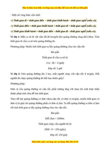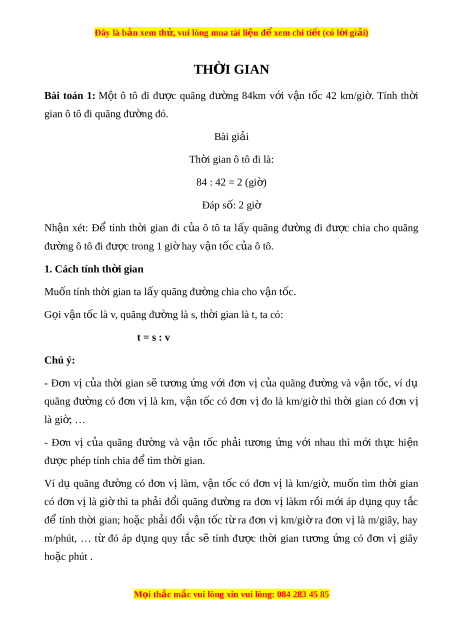 Đây là bản xem th , vu ử i lòng mua tài li u ệ đ xe ể m chi ti t ế (có l i ờ gi i ả ) TH I GIAN Ờ Bài toán 1: M t ộ ô tô đi đư c ợ quãng đư ng ờ 84km v i ớ v n ậ t c ố 42 km/gi . ờ Tính th i ờ gian ô tô đi quãng đư ng ờ đó. Bài gi i ả Th i ờ gian ô tô đi là: 84 : 42 = 2 (gi ) ờ Đáp số: 2 giờ Nh n ậ xét: Để tính th i ờ gian đi c a ủ ô tô ta l y ấ quãng đư ng ờ đi đư c ợ chia cho quãng đư ng ờ ô tô đi đư c t ợ rong 1 gi hay v ờ n t ậ c c ố a ủ ô tô. 1. Cách tính th i ờ gian Muốn tính th i ờ gian ta l y quãng đ ấ ư ng ờ chia cho v n ậ t c. ố G i ọ v n t