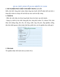 ị iodine 1%, ethanol 70%, bình th y ủ tinh mi ng ệ r ng, ộ đèn c n, ồ c c ố đong, nư c, ớ k p, ẹ đĩa petri, ng ố nghi m ệ , ki ng, ề tấm t n nhi ả ệt (gause), diêm (ho c b ặ t ậ l a ử ), phi u ế báo cáo thí nghi m ệ theo m u g ẫ i ợ ý. 2. Ti n hành ế Thí nghi m ệ đư c ợ ti n hành nh ế s ư au (hình 20.2): - Bư c ớ 1: L y ấ 1 ch u ậ tr ng