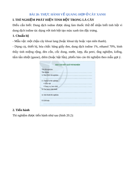 nghiệm ra chỗ có ánh sáng (hình 20.3). - Bư c ớ 4: Sau 4 – 6 gi , ờ ng t ắ lá c a ủ m i ỗ cây để thử tinh b t ộ b ng ằ dung d ch ị iodine (nh t ư hí nghi m ệ phát hi n t ệ inh b t ộ trong lá cây). 3. Báo cáo k t ế qu :