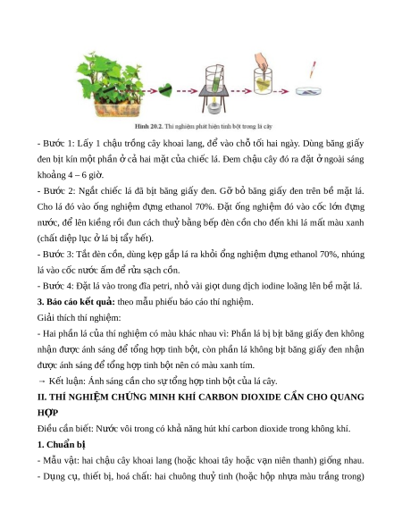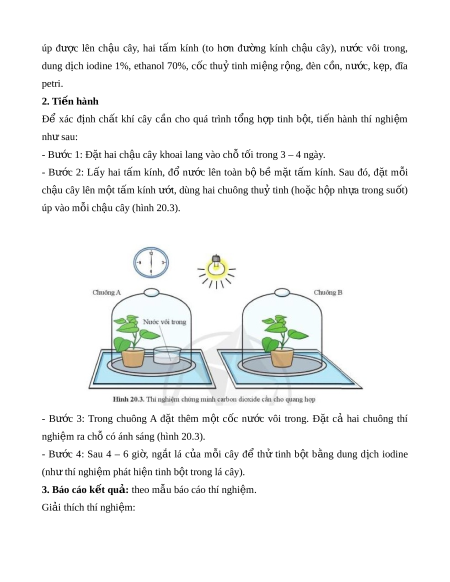 ị iodine 1%, ethanol 70%, c c ố thu ỷ tinh mi ng ệ r ng, ộ đèn c n, ồ nư c, ớ k p, ẹ đĩa petri. 2. Ti n hành ế Để xác đ nh ị ch t ấ khí cây c n ầ cho quá trình t ng ổ h p ợ tinh b t ộ , ti n ế hành thí nghi m ệ nh s ư au: - Bư c ớ 1: Đ t ặ hai ch u cây khoai ậ lang vào ch t ỗ i ố trong 3 – 4 ngày. - Bư c ớ 2: L y ấ hai t m ấ kính, đổ nư c ớ lên toàn bộ bề m t ặ t m ấ kính. Sau đó, đ t ặ m i ỗ ch u ậ cây lên m t ộ t m ấ kính ư t ớ , dùng hai chuông thu ỷ tinh (ho c ặ h p ộ nh a ự trong su t ố ) úp vào mỗi ch u ậ cây (hình 20.3). - Bư c ớ 3: Trong chuông A đ t ặ thêm m t ộ c c ố nư c ớ vôi trong. Đ t ặ cả hai chuông thí