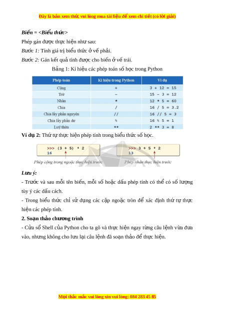 ế quả tính được cho bi n ế ở v t ế rái. B ng 1: ả Kí hi u các phép ệ toán s h ố c t ọ rong Python Ví d 2 ụ : Th t ứ t ự h c hi ự n phép t ệ ính trong bi u ể th c s ứ h ố c. ọ L u ý: ư - Trư c ớ và sau m i ỗ tên bi n, ế m i ỗ số ho c ặ d u