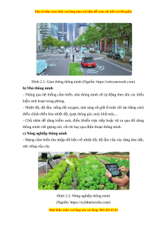 Hình 2.1: Giao thông thông minh (Ngu n: ồ https://erticonework.com) b) Nhà thông minh - Thông qua hệ th ng ố c m ả bi n, ế nhà thông minh s ẽ t ự đ ng ộ theo dõi các đi u ề kiện sinh ho t ạ trong phòng. - Nhi t ệ đ , ộ độ m ẩ , n ng ồ đ ộ oxygen, ánh sáng s ẽ gi ữ ở m c ứ t i ố u ư b ng ằ cách đi u ch ề ỉnh đi u hòa nhi ề ệt đ , qu ộ t ạ thông gió, máy kh m ử ùi,... - Chủ nhân dễ dàng ki m ể soát, đi u ề khi n ể tr c ự ti p ế ho c ặ từ xa qua đồ dùng thông minh v i ớ gi ng nói ọ , c chi ử hay qua đi n t ệ ho i ạ thông minh. c) Nông nghi p t ệ hông minh - M ng ạ c m ả bi n ế thu nh p ậ d ữ li u ệ v ề nhi t ệ đ , ộ đ ộ m ẩ c a ủ cây t ng ừ khu đ t ấ , s c ứ sống c a cây ủ . Hình 2.2: Nông nghi p t ệ hông minh