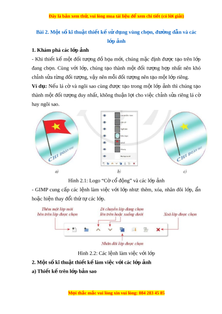 Đây là bản xem th , vu ử i lòng mua tài li u ệ đ xe ể m chi ti t ế (có l i ờ gi i ả ) Bài 2. M t ộ s kĩ ố thu t ậ thi t ế k s ế ử d ng vùng ch ụ n, đ ọ ư ng d ờ n và các ẫ l p ớ ảnh 1. Khám phá các l p ớ nh ả - Khi thi t ế kế m t ộ đ i ố tư ng ợ đồ h a ọ m i ớ , chúng m c ặ đ nh ị đư c ợ t o ạ trên l p ớ đang ch n. ọ Cùng v i ớ l p, ớ chúng t o ạ thành m t ộ đ i ố tư ng ợ h p ợ nh t ấ nên khó chỉnh s a ử t ng đ ừ ối tư ng, ợ v y nên m ậ ỗi đ i ố tư ng ợ nên t o m ạ t ộ l p r ớ iêng. Ví d : ụ N u