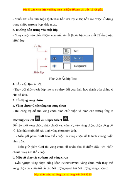Đây là bản xem th , vu ử i lòng mua tài li u ệ đ xe ể m chi ti t (c ế ó l i ờ gi i ả ) - Nhi u ề khi c n ầ th c ự hi n ệ l nh nhân ệ b n ả đôi l p ớ vì l p ớ b n ả sao đư c ợ s d ử ng ụ trong nhi u t ề rư ng ờ h p khác nhau. ợ b. Hư ng d ớ n t ẫ rung vào m t ộ l p ớ - Nháy chu t ộ vào bi u ể tư ng ợ con m t ắ sẽ t t ắ (ho c ặ b t ậ ) con m t ắ đ ể n ẩ (ho c ặ hiện) l p. ớ Hình 2.3: n l Ẩ p ớ Text 4. Sắp x p l ế i ạ các l p ớ - Thay đ i ổ thứ tự các l p ớ t o ạ ra sự thay đ i ổ c a ủ nh, ả h p ợ thành c a ủ chúng ở c a ử sổ nh. ả