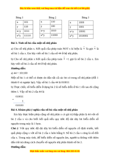 Đây là bản xem th , vu ử i lòng mua tài li u ệ đ xe ể m chi ti t (c ế ó l i ờ gi i ả ) Bài 3. Tính s bù c ố a m ủ t ộ s nh ố phâ ị n a) Cho số nhị phân x. K t ế quả c a ủ phép toán NOT x kí hi u ệ là x Ta g i ọ x là số bù 1 c a ủ x. Em hãy vi t ế s bù 1 c ố a s ủ ố 44 ở h nh ệ phân. ị b) Cho số nhị phân x K t ế quả c a ủ phép toán x +1 g i ọ là số bù 2 c a ủ x. Em hãy vi t ế số bù 2 c a s