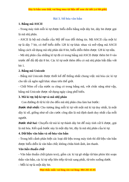 Đây là bản xem th , vu ử i lòng mua tài li u ệ đ xe ể m chi ti t ế (có l i ờ gi i ả ) Bài 3. S hóa văn b ố n ả 1. Bảng mã ASCII - Trong máy tính m i ỗ kí t ự đư c ợ bi u ể di n ễ b ng ằ m t ộ dãy bit, dãy bit đư c ợ g i ọ là mã nhị phân. - ASCII là bộ mã chu n ẩ c a ủ Mỹ để trao đ i ổ thông tin. Mã ASCII c a ủ m t ộ kí