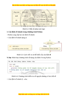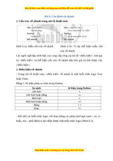 Đây là bản xem th , vu ử i lòng mua tài li u ệ đ xe ể m chi ti t (c ế ó l i ờ gi i ả ) Hình 6.2: M t ộ số phép toán logic 3. Câu l nh r ệ nhán ẽ h trong chư ng t ơ rình Python - Python cung c p hai ấ câu l nh r ệ nhánh: ẽ + Câu l nh r ệ nhánh d ẽ ng ạ if Hình 6.3: Cách vi t ế và sơ đ kh ồ i ố c a ủ câu l nh ệ if Ví d : ụ Minh h a ch ọ ư ng ơ trình sử d ng câu l ụ nh i ệ f trong Python Hình 6.4: Chư ng ơ trình ki m ể tra s nguyên d ố ư ng có ơ hai ch s ữ ố + Câu l nh r ệ nhánh i ẽ f – else: M i ọ thắc m c