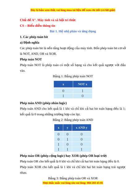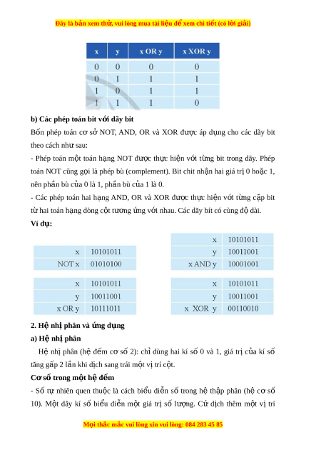ề Acs. Máy tính và xã h i ộ tri th c ứ CS – Bi u di ể n t ễ hông tin Bài 1. H nh ệ phâ ị n và ng d ứ ng ụ 1. Các phép toán bit a) Đ nh nghĩ ị a Các phép toán bit là n n ề t ng ả ho t ạ đ ng c ộ a ủ máy tính. B n ố phép toán bit c s ơ ở là NOT, AND, OR và XOR. Phép toán NOT