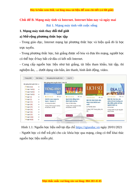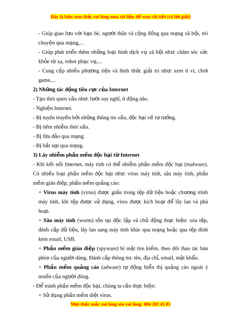 Đây là bản xem th , vu ử i lòng mua tài li u ệ đ xe ể m chi ti t ế (có l i ờ gi i ả ) - Giúp giao l u ư v i ớ b n ạ bè, ngư i ờ thân và c ng ộ đ ng ồ qua m ng ạ xã h i ộ , trò chuyện qua m ng,... ạ - Giúp phát tri n ể thêm nh ng ữ lo i ạ hình d ch ị vụ xã h i ộ nh : ư chăm sóc s c ứ kh e t ỏ xa, r ừ obot ph c v ụ ,... ụ - Cung c p ấ nhi u ề phư ng ơ ti n ệ và hình th c ứ gi i ả trí nh : ư xem ti vi, ch i ơ game,... 2) Nh ng t ữ ác đ ng t ộ iêu c c c ự a I ủ nternet - T o t ạ hói quen xấu nh : ư lư i ờ suy nghĩ, ít đ ng não. ộ - Nghiện Internet. - Bị tuyên truy n b ề i ở nh ng ữ thông tin x u, đ ấ c ộ h i ạ v t ề t ư ư ng. ở - Bị tiêm nhi m ễ thói x u. ấ - Bị l a đ ừ o qua m ả ng. ạ - Bị b t ắ n t ạ qua m ng. ạ 3) Lây nhi m ễ ph n m ầ m ề đ c h ộ i ạ t I ừ nternet - Khi k t ế n i