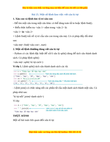 Đây là bản xem th , vu ử i lòng mua tài li u ệ đ xe ể m chi ti t (c ế ó l i ờ gi i ả ) Bài 25. M t ộ số l n ệ h làm vi c v ệ i ớ xâu kí tự 1. Xâu con và l nh t ệ ìm v t ị rí xâu con - Đ t ể ìm m t ộ xâu trong m t ộ xâu khác có th dùng t ể oán t i ử n ho c l ặ nh f ệ ind(). + Bi u ể th c ki ứ m ể tra n m ằ trong là: in + L nh f ệ ind() tr v ả v ề t ị rí c a xâu con t ủ rong xâu m . C ẹ ó cú pháp đ y đ ầ nh ủ ư sau: .f ẹ ind(, start) 2. M t ộ s l ố nh t ệ hư ng dùng v ờ i ớ xâu kí tự - Python có các l nh ệ đ c ặ bi t ệ đ ể x