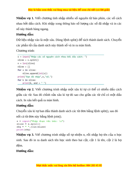 ử xâu kí tự đó sao cho gi a ữ các từ chỉ có m t ộ d u ấ cách. In xâu k t ế qu r ả a màn hình. Hư ng d ớ ẫn: Chuy n ể xâu kí t ban đ ự u t ầ hành danh sách các t đ ừ n b ơ ng l ằ nh s ệ plit(), sau đó nối cá t đ ừ n ơ này b ng l ằ nh j ệ oin(). Nhi m