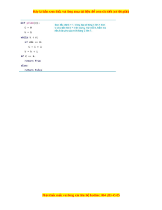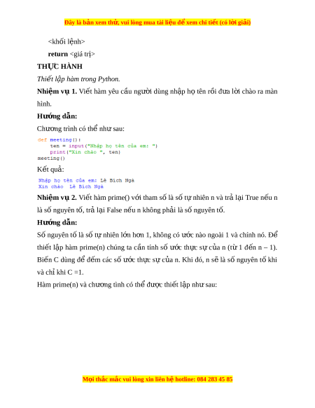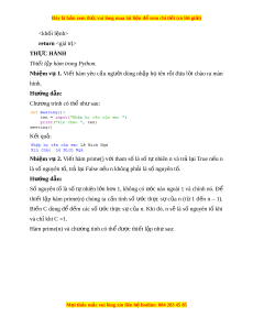 Đây là bản xem th , vu ử i lòng mua tài li u ệ đ xe ể m chi ti t (c ế ó l i ờ gi i ả ) ệ > return ị TH C Ự HÀNH Thi t ế l p ậ hàm trong Python. Nhi m ệ vụ 1. Vi t ế hàm yêu c u ầ ngư i ờ dùng nh p ậ h ọ tên r i ồ đ a ư l i ờ chào ra màn hình. Hư ng d ớ ẫn: Chư ng t ơ rình có th nh ể s ư au: K t ế qu : ả Nhi m ệ v ụ 2. Vi t ế hàm prime() v i ớ tham số là s t ố ự nhiên n và tr l ả i ạ True n u ế n là số nguyên tố, tr l ả i ạ False n u n không ph ế i ả là s nguyên t ố . ố Hư ng d ớ ẫn: