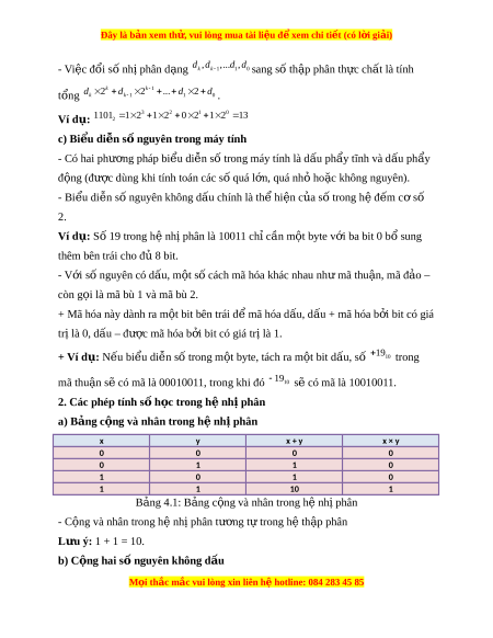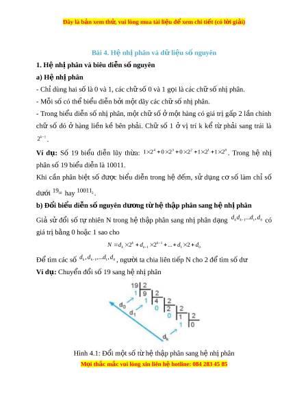 Đây là bản xem th , vu ử i lòng mua tài li u ệ đ xe ể m chi ti t (c ế ó l i ờ gi i ả ) Bài 4. H n ệ h phân và d ị l ữ i u s ệ nguyên ố 1. H nh ệ phân và b ị iêu di n s ễ nguyên ố a) H nh ệ p ị hân - Ch dùng hai ỉ số là 0 và 1, các ch s ữ ố 0 và 1 g i ọ là các chữ s nh ố phân. ị - Mỗi số có th bi ể u di ể n ễ b i ở m t ộ dãy các chữ s nh ố phân. ị - Trong bi u ể di n ễ số nh ịphân, m t ộ ch ữ s ố ở m t ộ hàng có giá tr ịg p ấ 2 l n ầ chính chữ số đó ở hàng li n ề kề bên ph i