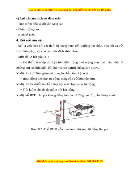 Đây là bản xem th , vu ử i lòng mua tài li u ệ đ xe ể m chi ti t (c ế ó l i ờ gi i ả ) c) L i ợ ích c a d ủ ch v ị đám ụ mây - Tính m m ề d o và đ ẻ s ộ n s ẵ àng cao - Chất lư ng cao. ợ - Kinh t h ế n. ơ 4. K t ế n i ố v n v ạ t ậ - IoT là vi c ệ liên k t ế các thi t ế b ịthông minh đ ể t ự đ ng ộ thu nh p, ậ trao đ i ổ và xử lí d l ữ i u ph ệ c v ụ cho ụ các m c đí ụ ch khác nhau. - M t ộ số l i ợ ích c a I ủ oT: + Có thể thu nh p ậ dữ li u ệ trên di n ệ r ng ộ nhờ m ng ạ máy tính; làm vi c ệ ở nh ng n ữ i ơ có đi u ki ề n b ệ t ấ l i ợ mà con ngư i ờ không làm đư c. ợ Ví d : ụ Ghi d l ữ i u gi ệ ám sát trong lò ph n ả ng h ứ t ạ nhân. + Ho t ạ đ ng l ộ iên t c, t ụ đ ự ng, ộ cung c p d ấ l ữ i u t ệ c ứ th i ờ . Ví d : ụ Đi u khi ề n ể lò ph n ả ng h ứ t ạ nhân hay lái xe t đ ự ng. ộ + Ti t ế ki m ệ chi phí do gi m ả b t ớ lao đ ng. ộ Ví d v ụ I