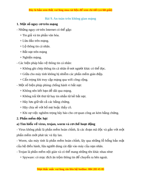 ữ cho máy tính không b nhi ị m ễ các ph n m ầ m ề gián đi p. ệ + Cẩn tr ng khi ọ truy c p m ậ ng ạ qua wifi công c ng. ộ - M t ộ số bi n pháp ệ phòng ch ng hành ố vi b t ắ n t ạ : + Không nên k t ế b n d ạ dãi ễ qua m ng. ạ + Không tr l ả i ờ th t ư ừ hay tin nh n t ắ k ừ b ẻ t ắ n t ạ . + Hãy l u ư giữ t t ấ cả các b ng ằ ch ng. ứ + Hãy chia s v ẻ i ớ b m ố ho ẹ c t ặ h y cô. ầ + Khi sự vi c nghi ệ êm tr ng ọ hãy báo cho c quan ơ công an kèm b ng ằ ch ng. ứ 2. Phần m m ề đ c ộ h i ạ a) Tìm hi u v ể vi